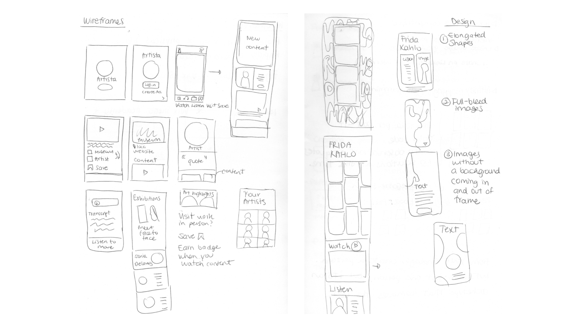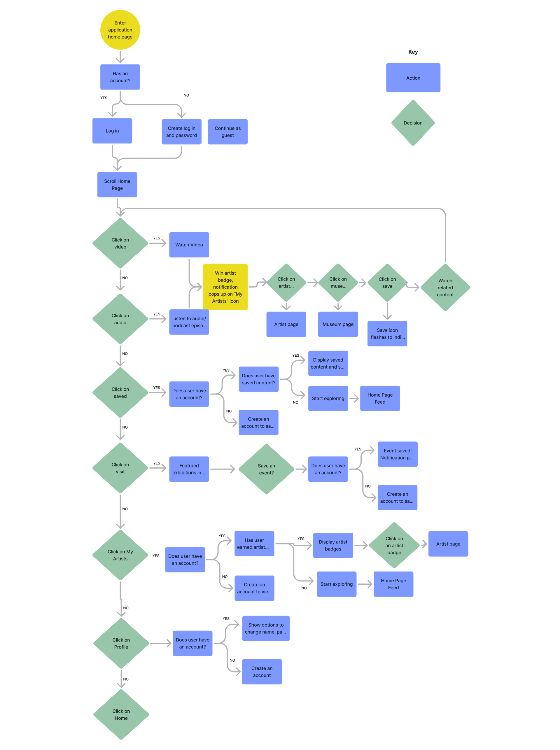 The research highlighted the need for clear, curated content that prioritizes educational value. This influenced the user flow by ensuring that the main features of the app—such as video and audio sections—are prominently placed and easily accessible. The flow includes a straightforward navigation from discovering content to engaging with detailed information about exhibitions and artist backgrounds.